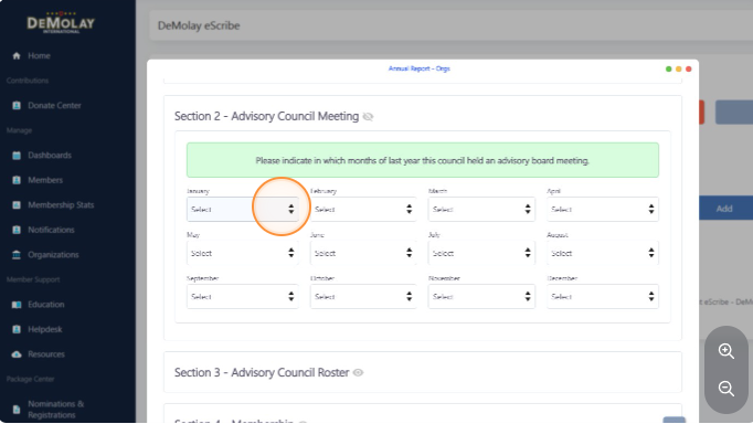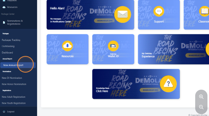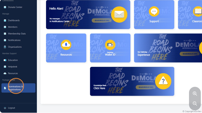 Navigate to https://escribe.demolay.org/home/ and click "Nominations & Registrations" from the left hand side menu.