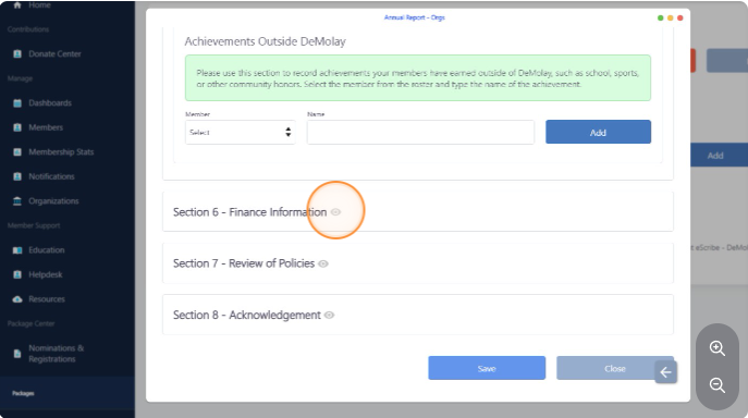 Section 6: Finance information. Expand this area to insert pertinent information regarding the organization financials.